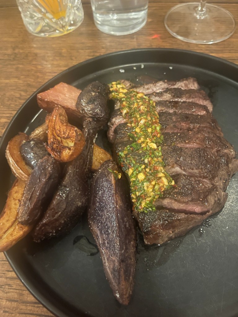 I ordered the flat iron steak with chimichurri and tri color potatoes.