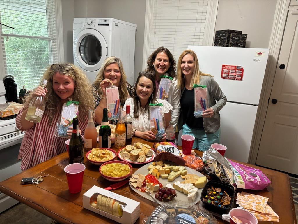 Joanne and I were the first to arrive and we prepared snacks while we waited. The car full of Tanya, Jenn, and Marilyn arrived shortly after, and then Maria arrived. Here we are showing our sweet gifts from Tanya of notepads, flair pens, and hand sanitizer in a cute wrapping. So thoughtful!