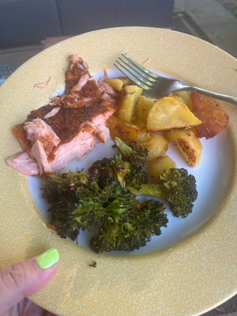 I made the best salmon I’ve ever made, a new broccoli recipe, and English style Yukon Gold potatoes.