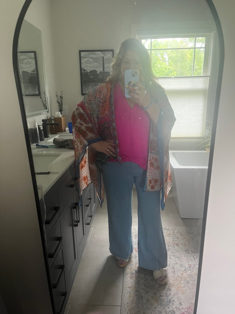 This was a happy hour ‘fit! I am wearing my new Dr. Scholl’s buckle heels, my light Halaras and then two consignment items – the magenta blouse and the scarfy kimono are both from consignment stores. A teenager that I don’t know at the shopping center where my happy hour was complimented my outfit, too.