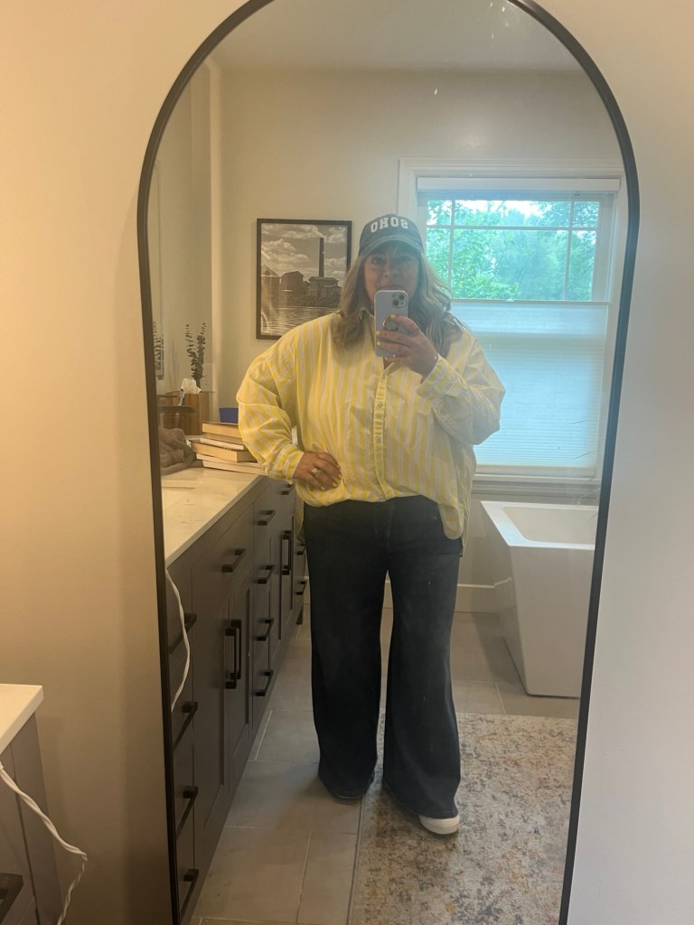 Sunday was rainy and I forgot a cardinal rule – no wide leg flares on rainy days. My hems were soaked! I have on my Aerie button up and my JCPenney Soho baseball cap.