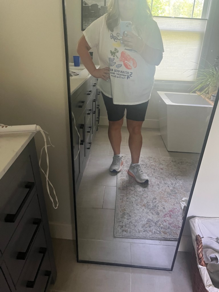 I have a closet full of cute “going out” clothes, that I struggle with because when I am running to the grocery store and tan, why would I wear them and wear gym shorts and tee’s and tanks. I don’t see getting all ready to do those stupid errands, and then come home walk the dog, clean and sweat? You know?