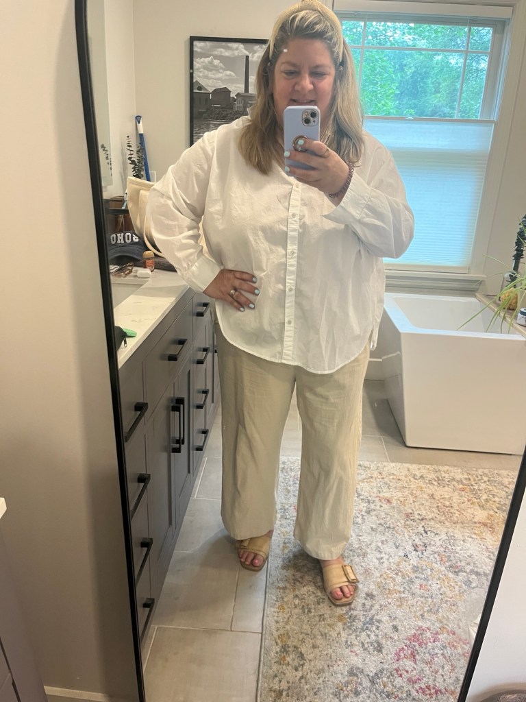 This doesn’t work because the pants are wide leg and the shirt is oversized. I had to put something on to run a quick errand and it was a cooler day.