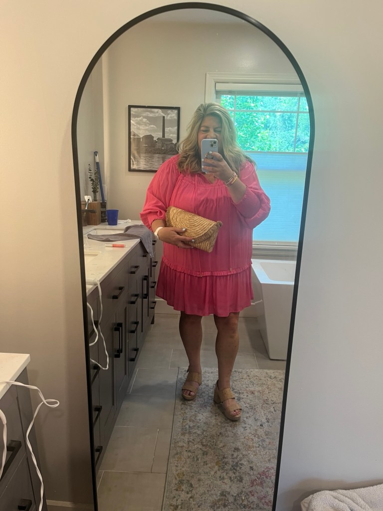 My friend Beth invited me to lunch to celebrate my retirement and I wore my new pink dress. I have the same dress in salmon. I used my consignment straw clutch and wore my Aerosoles cork camera sandals.