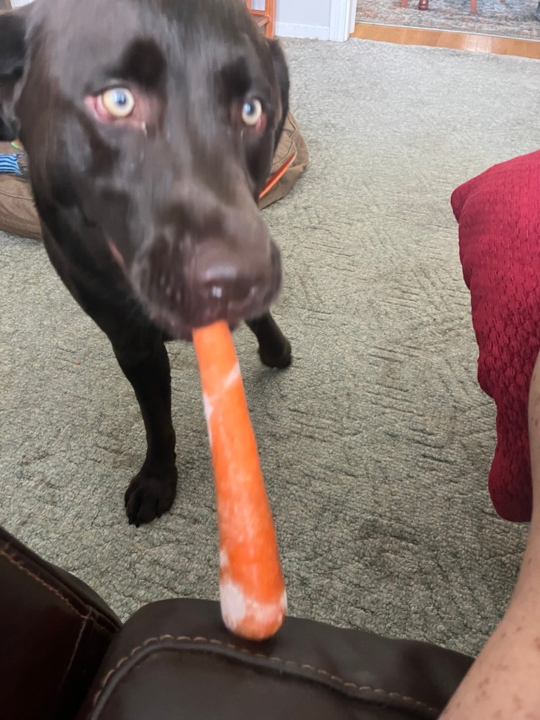 After that we went to Barnes and Noble book store and then we went home. I was so hot and ready to be in the AC. I gave Eddie Otis a frozen carrot because I figured he was hot, too. He wants you to participate just like he wants you to participate in bone chewing. He is a sharing boy.