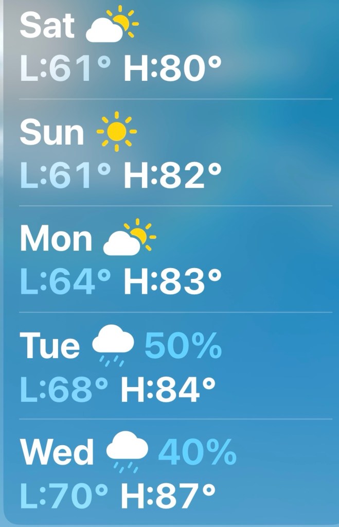 11. While I didn’t watch Colbert, I’m more than a little concerned at the thought he was most likely cancelled due to a favor needed by the conglomerate that owned his station. I don’t like to text because I want immediate answers. I’d rather talk on the phone but not for long. I abhor group texts. Your weather looks wonderful. I know we’re due for a cool down, and I’m ready for it.