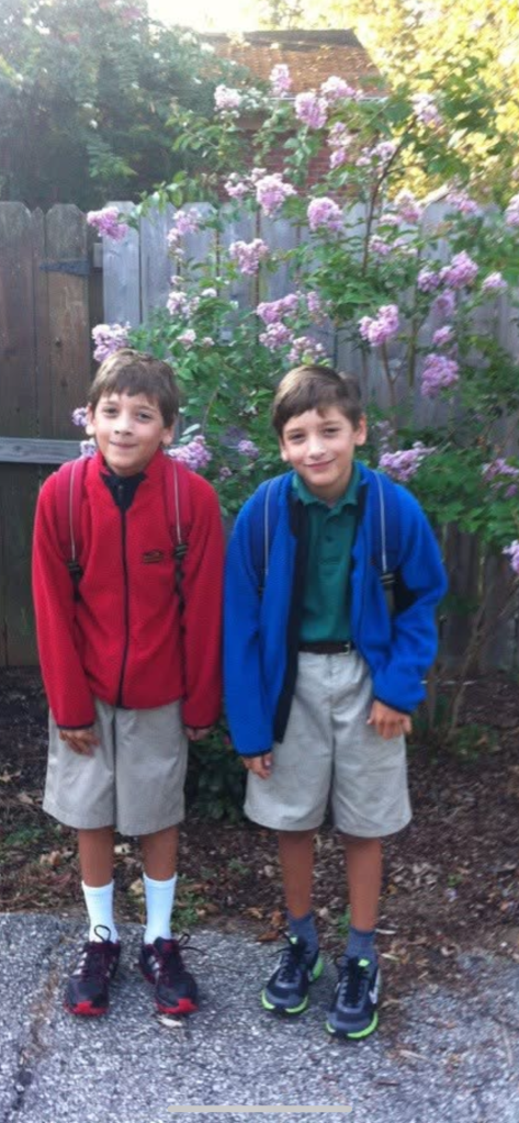 It’s so hard to see these photos sometimes. This was about this time of year when they were getting ready to walk to school. We almost always put Jack in red because that was his favorite color. Mason was usually blue or green. Look how tan these little squirts were.