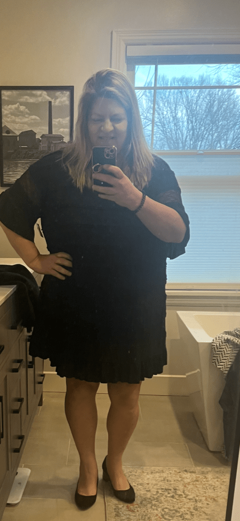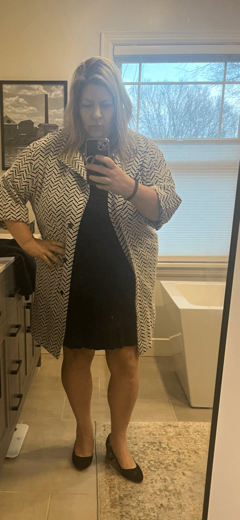 This is a dressy Chico’s jacket and it’s quite a sweet story, I think. It looks weird with the long sleeve black tee, but it looks better with naked forearms. I wasn’t happy with my selection of clothing for my mom’s visitation and funeral so I went to one of my consignment stores. There was a short sleeve black Umgee (one of my fave brands) dress in my size and this coat. My mom would have been so thrilled with my finds and maybe, just maybe she helped me out?