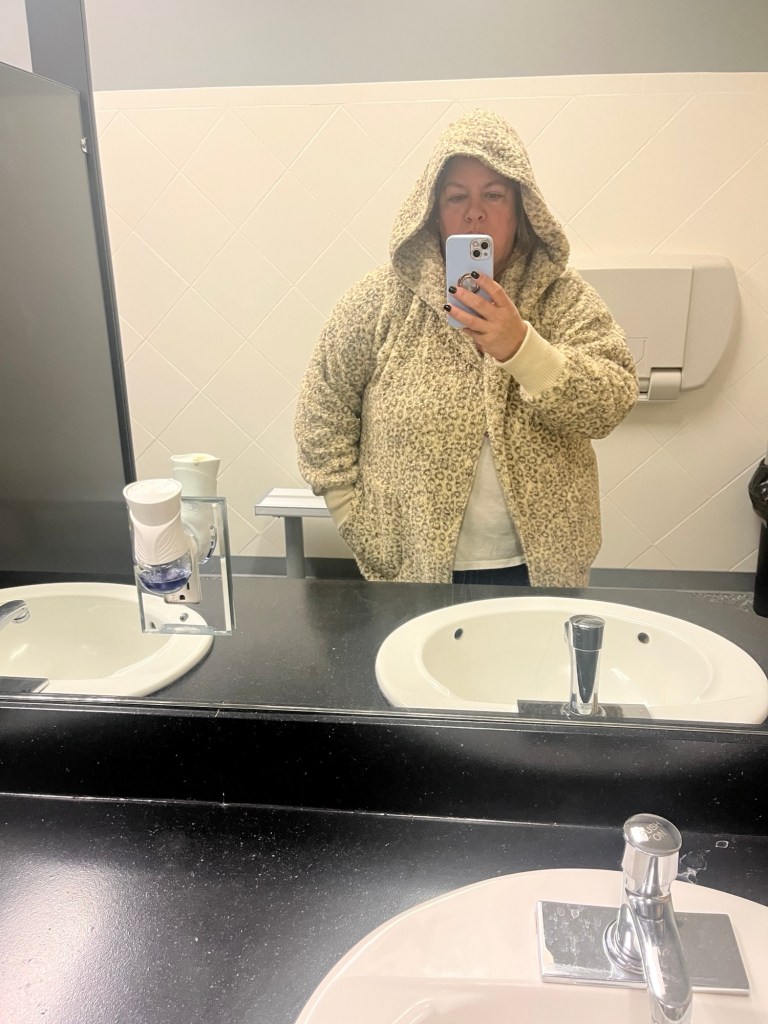 This jacket below is one I got for free! The boutique Tunie’s has a thing every year where if you spend $30 you get a free poncho, vest, jacket, or something that they pick up at market – a pretty nice freebie. This was last year’s gift with purchase. I have been wearing this to the gym because it’s so cozy and it helps me open the door to the cold at 6 a.m.