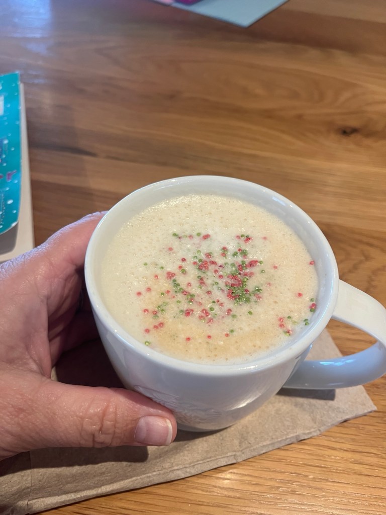 It was a treat to go to a Starbuck’s and be asked if I wanted my “for here coffee” in a real mug. I got a sugar cookie latte and I was tickled by the sprinkles, too.