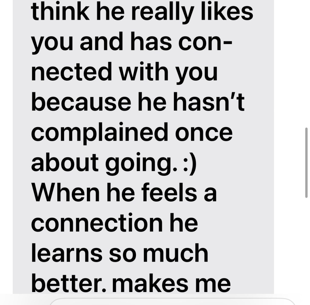 He drives himself so I texted his mom afterward to tell her how it went. Her response made me feel good.