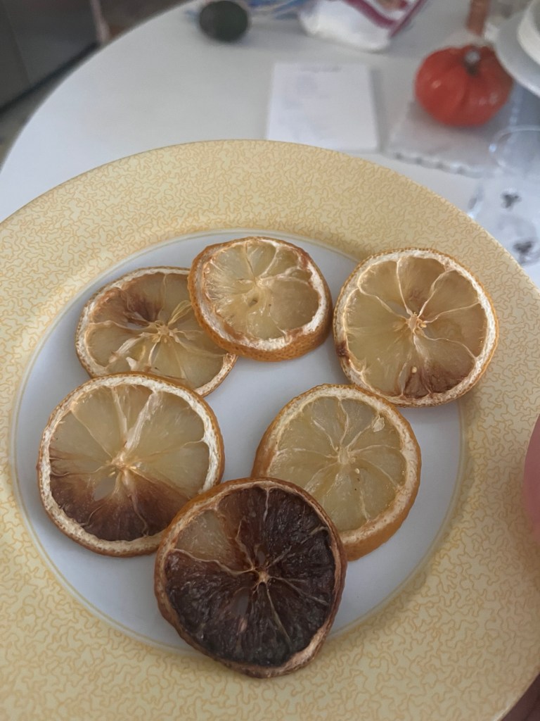 I did a fun project of drying out lemon slices in the oven at 225 for 2 hours. I took mine out a bit before 2 hours. These are all the rage in cocktails right now.