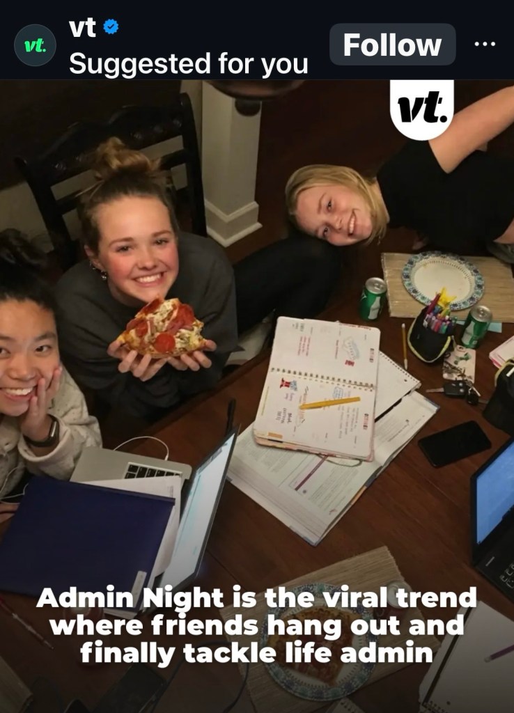 I think this is actually a good idea and I had already heard of version of it on the Midlife Matters podcast. You get together with friends to tackle those nagging tasks like cancelling subscriptions. Would you go to an admin night? I would have to go to an admin day or admin morning. I know myself and I can’t tackle anything like that after dinner.