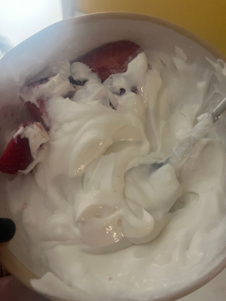 New strategy. Yogurt as dessert. I like OIKOS Pro Vanilla. I like frozen fruit and I like to set it out to defrost so all the juice gets in the yogurt. I think I am going to add a few mini chocolate chips and put it in the freezer for after dinner, too. I currently don’t have pb powder but that would be good, too. Do you have a favorite yogurt? I tried straight up Greek and couldn’t do it.