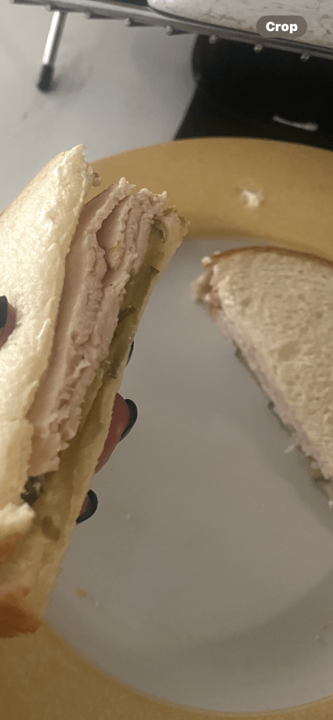 Another new strategy – getting protein through the humble sandwich. Did you read my Tuesday post? Thank you for your comments and ideas for me! I love pickles. This is turkey, pickles, and a little bit of mayo on a light bread.