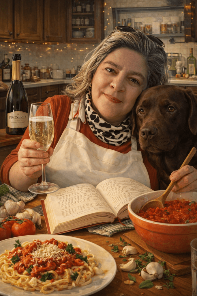 I asked it to make me a photo with things I love – cooking, reading, prosecco, and chocolate labs. Look at my scarf! I am trying to wear all of my scarves over the next week for my challenge! I am mad that AI didn’t polish my nails. How much does that look like Eddie Otis? I didn’t even give a photo of him. I only gave a headshot of myself.