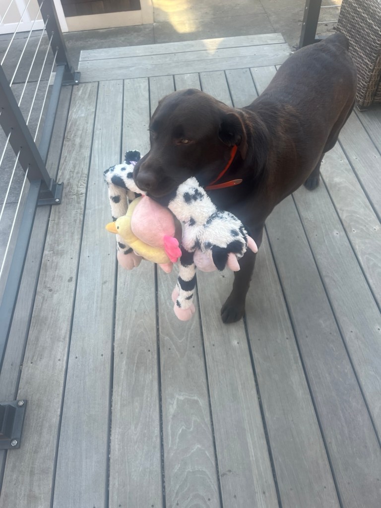 I love my stuffies. Boy, do they get me a lot of them. I am not supposed to, but I love taking them outside. Here I am with two in my mouth at the same time! I mean – heck – I didn’t even know it at the time, but now I’m thinking that was pretty cool.