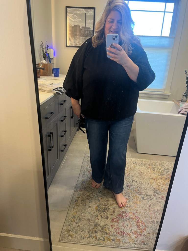 This was my Friday outfit that went from day to night. I am wearing my first and only pair of Halara jeans that button and zip. My other pairs are all pull on. These have a fun side detail and I love them. I’m wearing a textured black blouse.