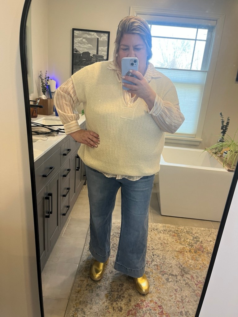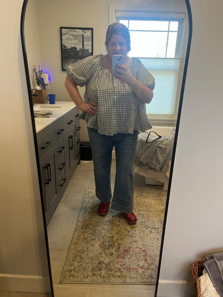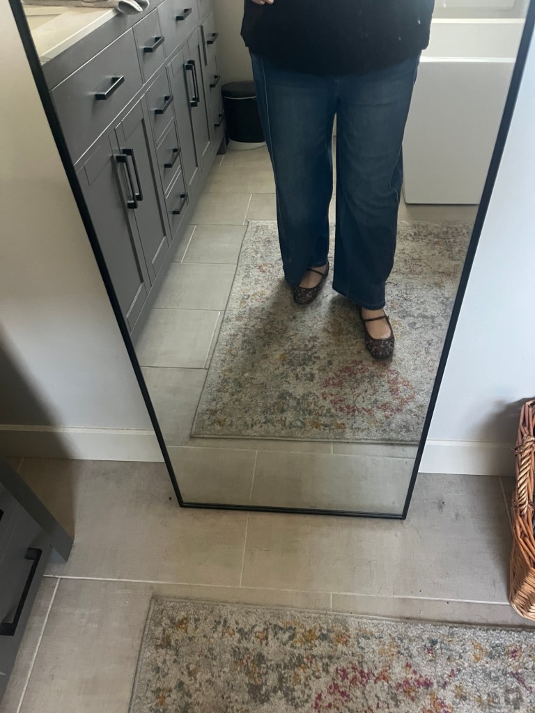 Did you notice my jeans in the first four photos? They are my first non-Halara jean purchase since 2023 if my records are correct. They are fabulous and a rec from Tanya. Here they are. I don’t know what to tell you about sizing. I had ordered two sizes and both fit but the larger one stretched out throughout the day. I would say they might run slightly big or true to size. That was really helpful, no? They have a little bit of stretch to them. Also, you see they are cropped on the model and then look at the length on me above. I really like buying cropped jeans because they are the right length on me! I am 5’4.