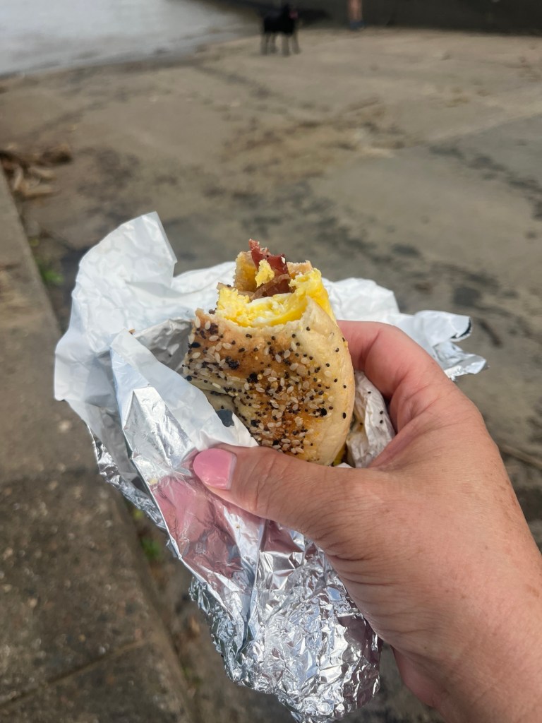 I got bagel sandwiches for Tom and I and we had a picnic at the river while EO swam a bit.