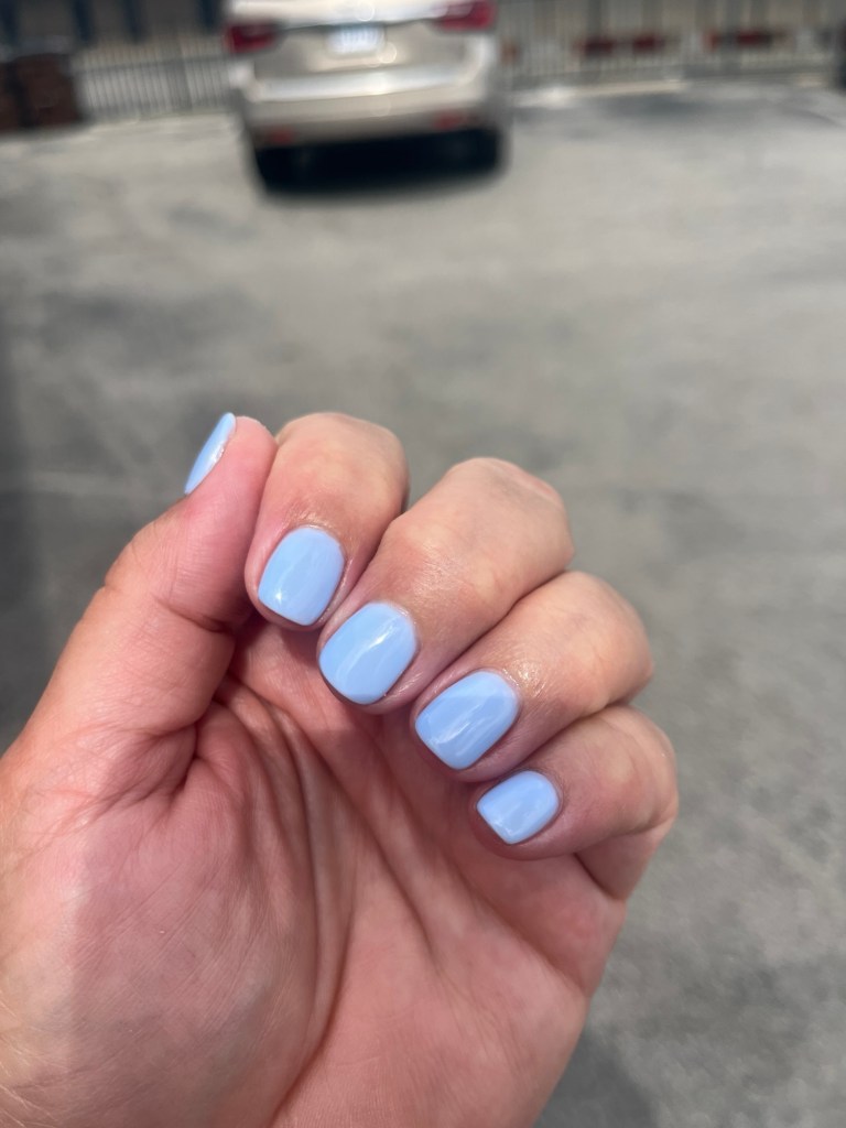 One nail chipped in two days and I went back and got it fixed. They added another topcoat, then the topcoat peeled off, then another nail chipped – it was bad. I went to my friend’s preferred salon (a different one) on Saturday and had it removed and got this gel mani: