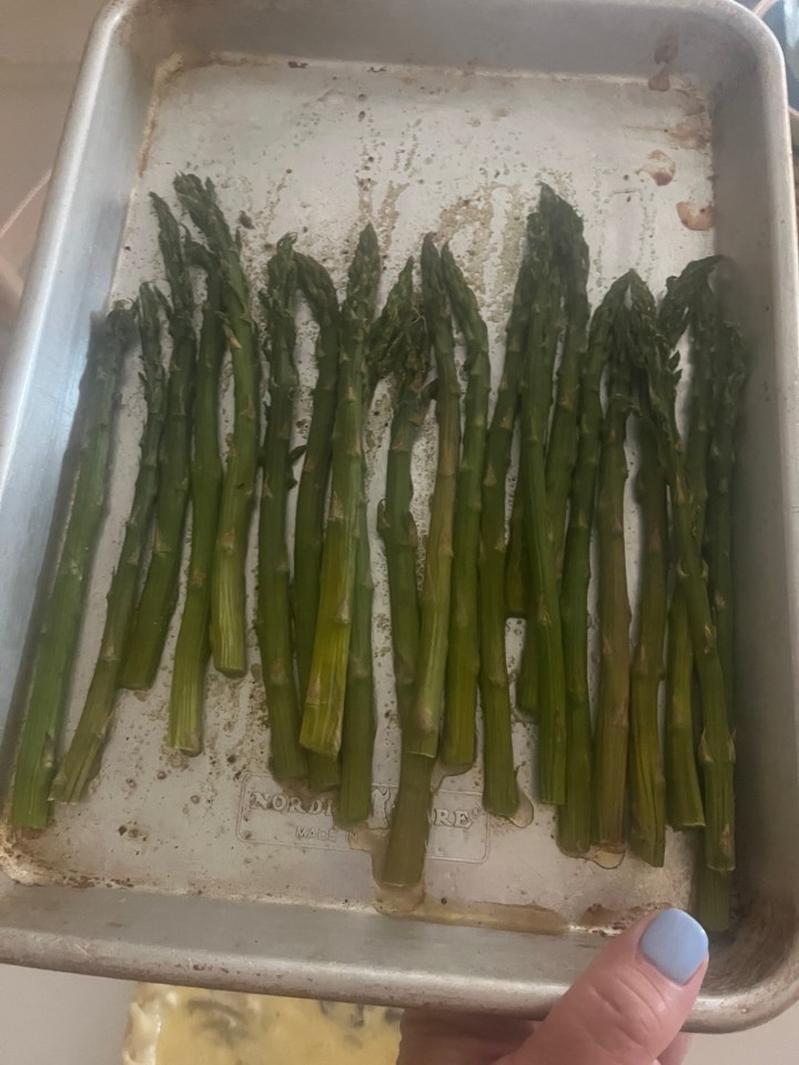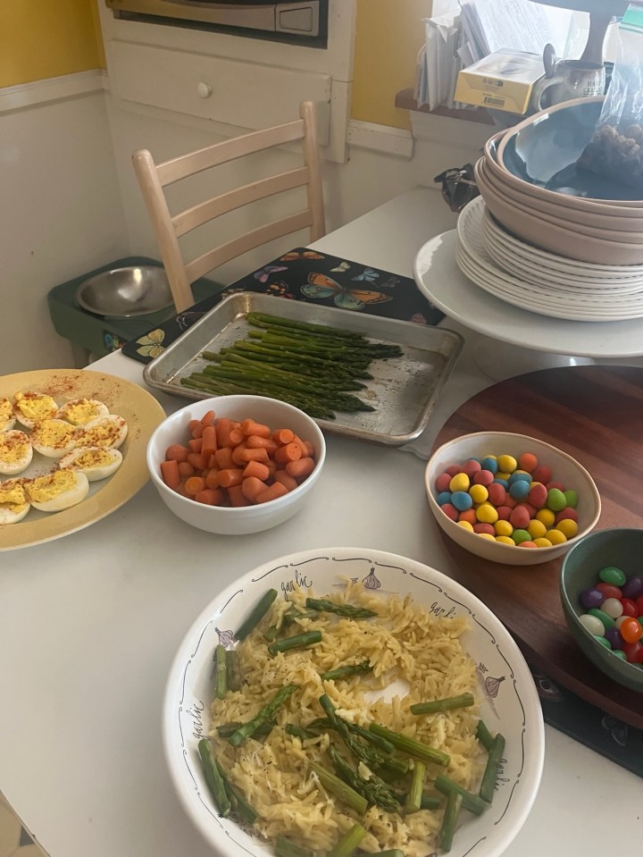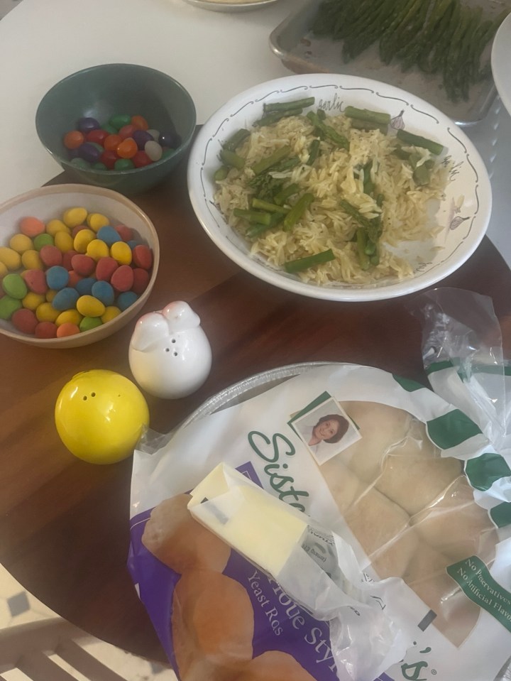 I bought a ham that wasn’t cut and that was a disaster! Also, I thought it was a small ham for $6.99 and it was a big old ham for $6.99 a pound. In that case, I should have gone in to Kroger and not done pick up! I made asparagus, asparagus orzo, Sister Schubert’s rolls,