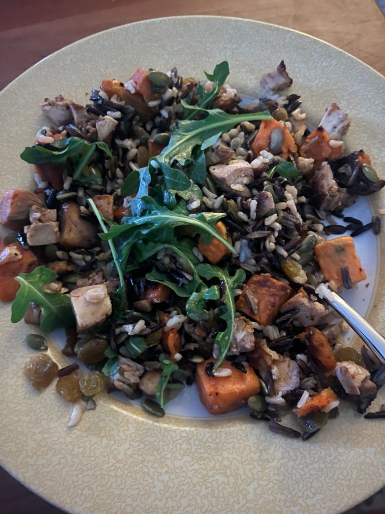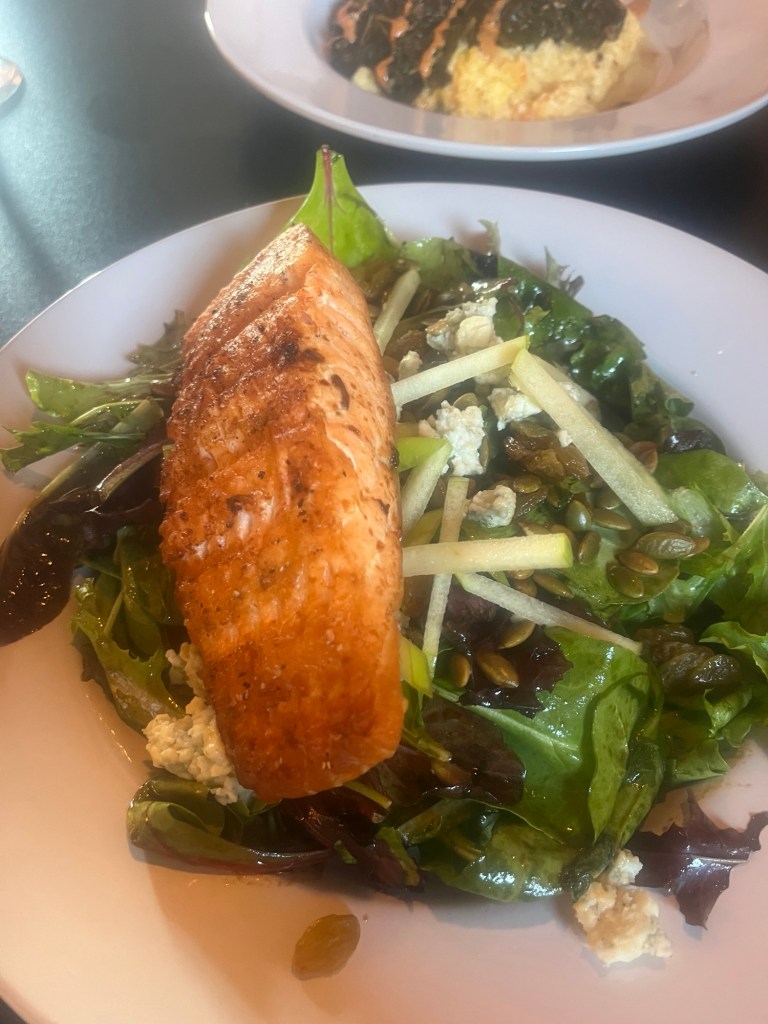 I had my favorite meal of 2026 I do believe. I ordered a salad that had pumpkin seeds, green apples, blue cheese, and a maple bourbon vinaigrette. I added salmon. It was so good.