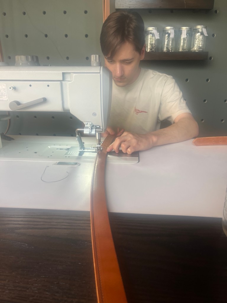 Mason is learning their new belt bar. You come in, pick your leather, pick your color stitching, and pick your hardware. This would be a great Father’s Day gift if you are local.