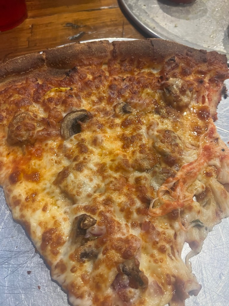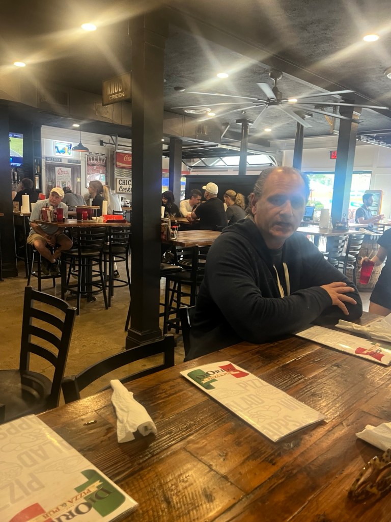 Tom got home from hiking and we grabbed the husbands and went to Diorio’s Pizza. Tom was talking here and we were waiting on the third couple.