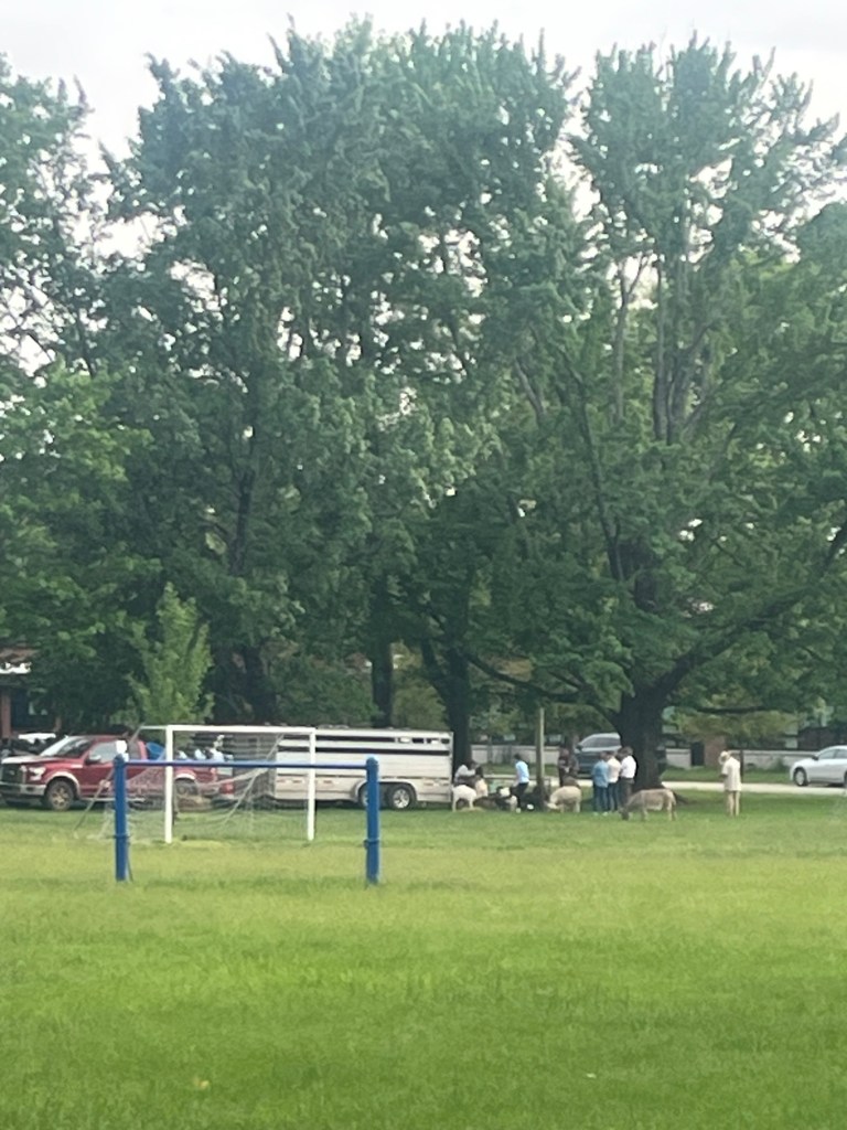 Having a school playground behind our house has been interesting. We have had hot air balloons land there in the past. This week there were donkeys and goats for an evening event!