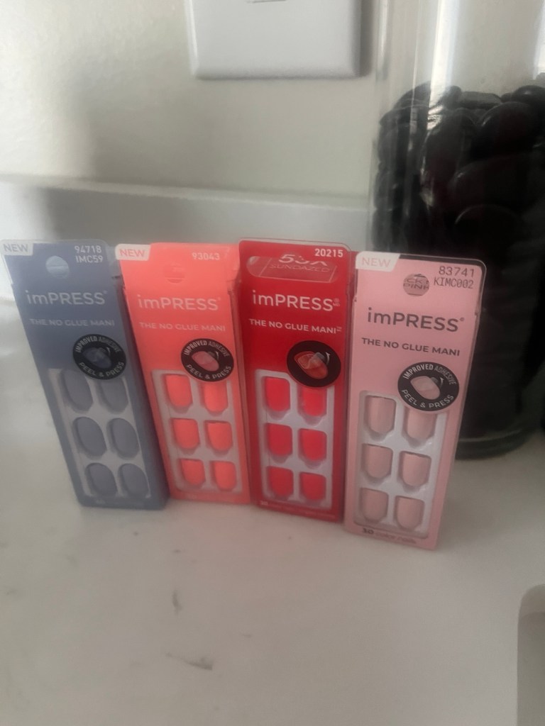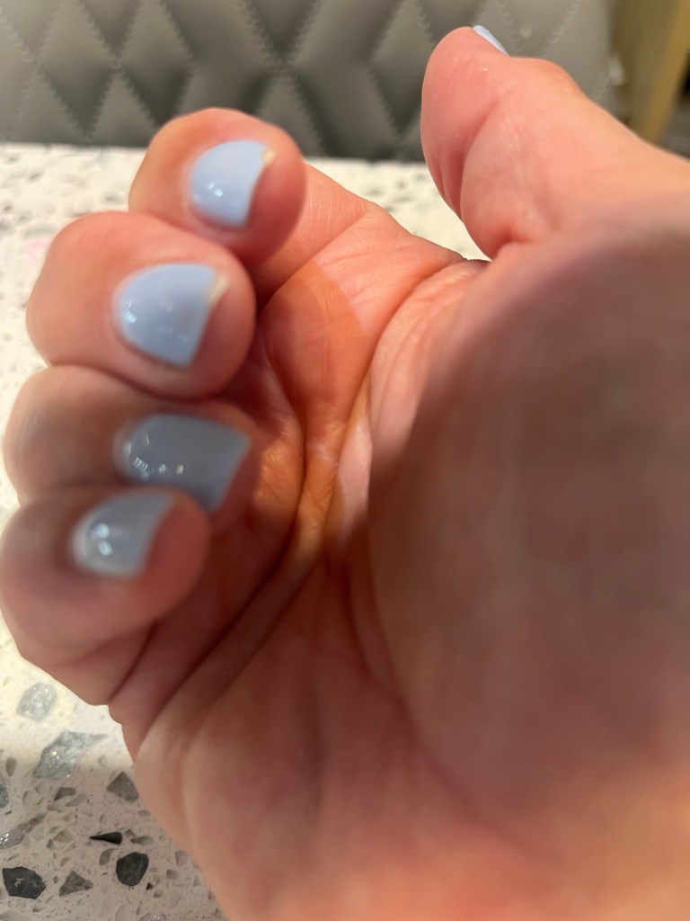 My gel polish journey has come to an end for now. I got a bad one in pink that chipped in one day, got it re-done, and then the clear top coat peeled off, had that re-done in this blue and it chipped in two weeks. I just don’t want to be in the nail salon that much. I had this removed this week. It was a bear to get off. That’s the worst part of gel. I was just trying something different and it made me realize I’m just fine with my press-on nail life.
