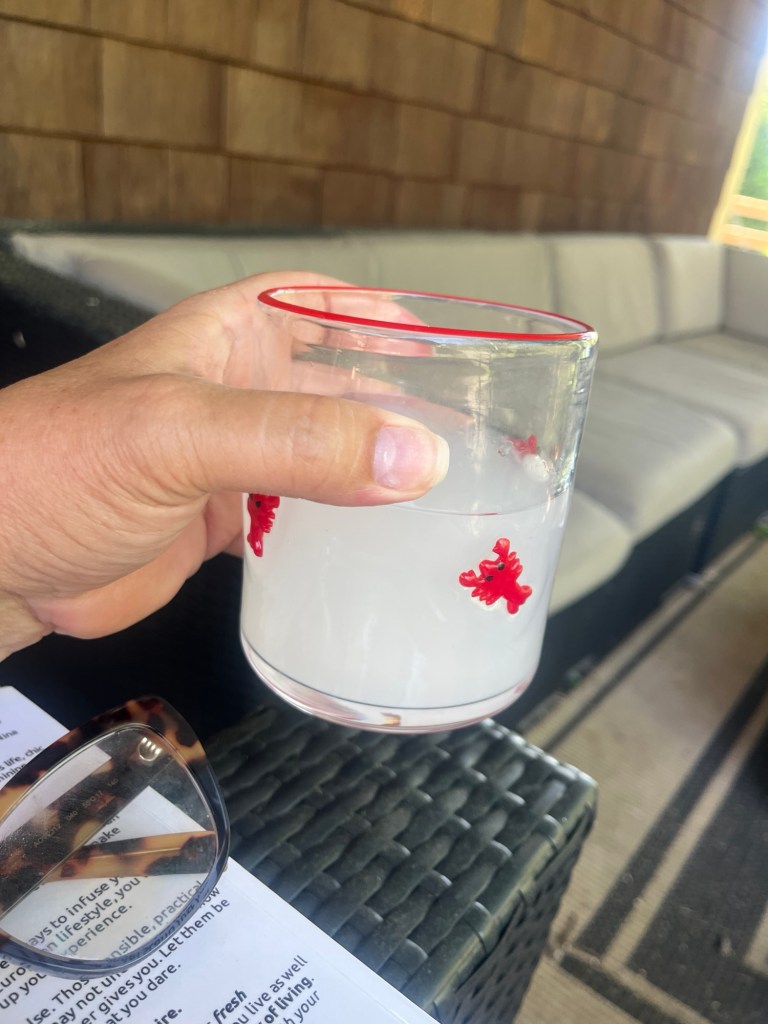 No – I have not bought any more icon glasses – yet – but I enjoyed my lobster glass this week! I have bows and hearts, too. The glasses are big and kind of hard to hold even for my pretty large hand. They are very heavy. Some of you with tiny hands might not like their heft.