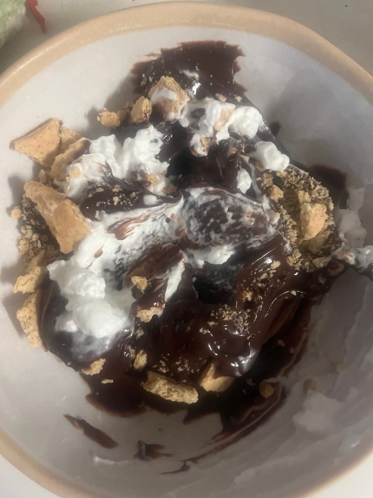 My hair stylist recommended Jell-O dark chocolate pudding cups with a graham cracker crumbled in and I added a squirt of Redi-Whip. It’s delish!