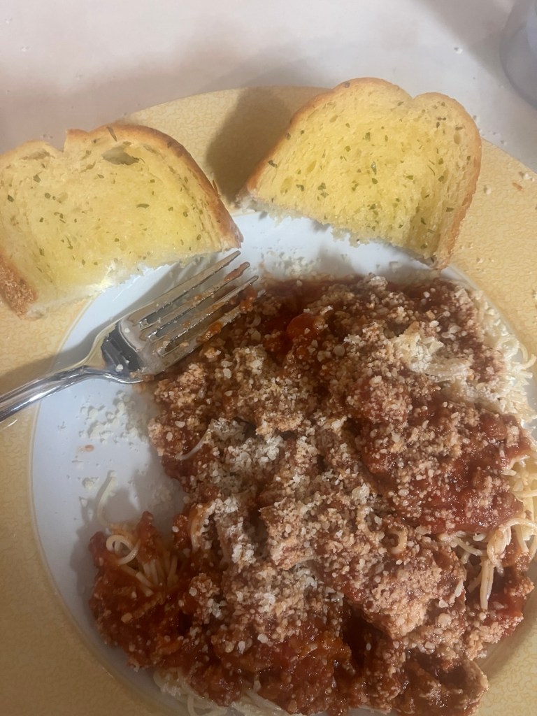 I got both kids home for dinner last night! We had spaghetti and Texas Toast and they were very happy.