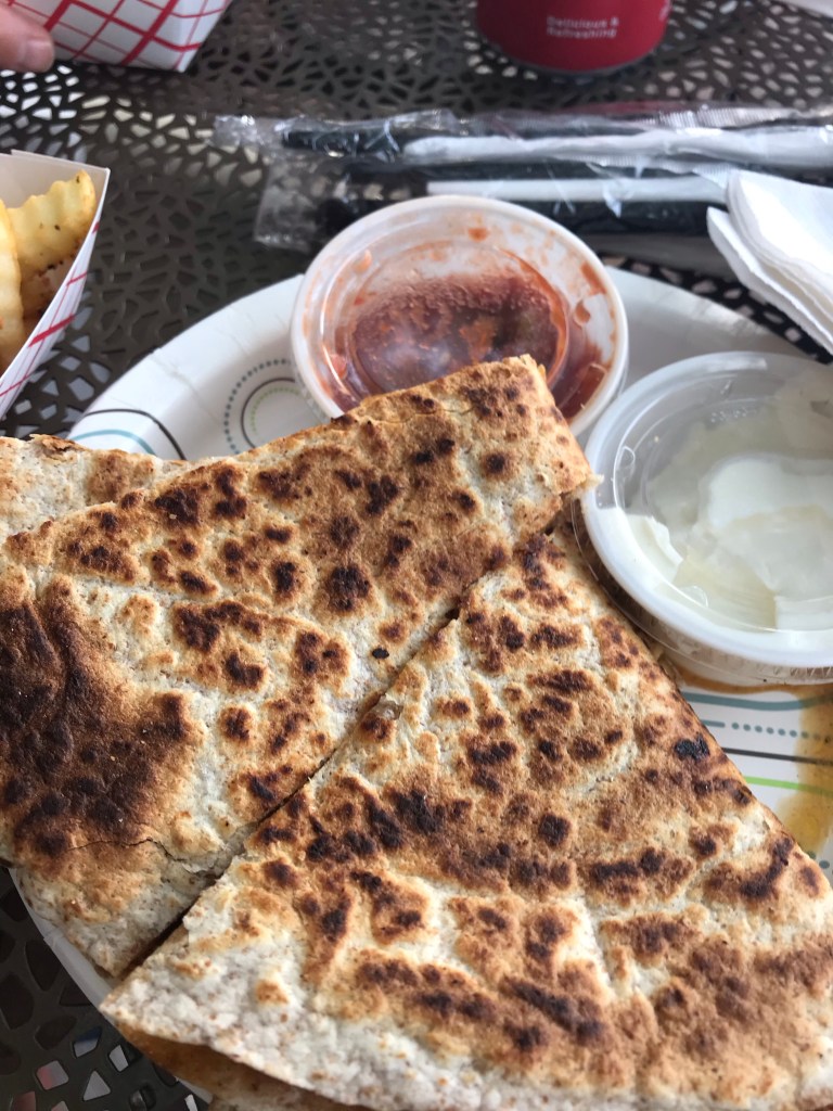 Tom had a brat and I had the inside of a quesadilla and some fries. The place we chose just had bar food.