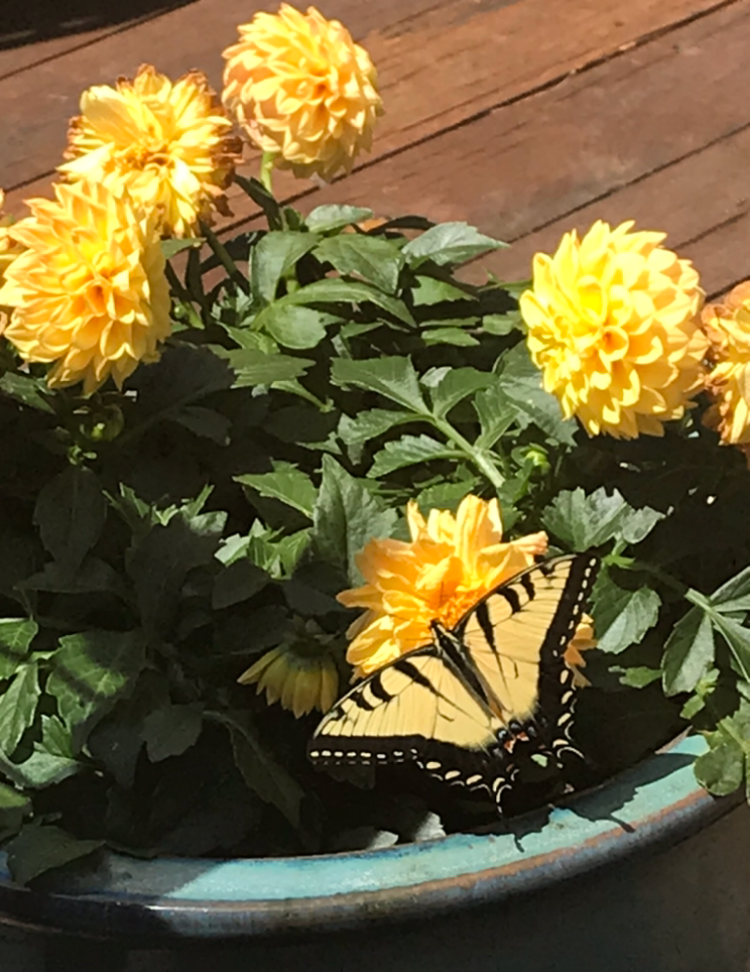 I was way too proud of myself for putting four flower flats in my turquoise pot and was so happy to come home one day from running an errand to see this butterfly enjoying them, too! The butterfly knew what was up with my color scheme!