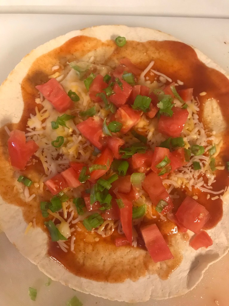 Did you hear Taco Bell took their Mexican Pizza off the menu? I have fond memories of this item because my bestie was a vegetarian and still is and would always order it with no meat. So, I tried it with her many years ago and loved it! I came across a low carb copycat version and it was really good! It is just refried beans between two low carb tortillas, (I heated the tortillas in a skillet), taco sauce, cheese, tomatoes, and green onions. This was my lunch one day this week!