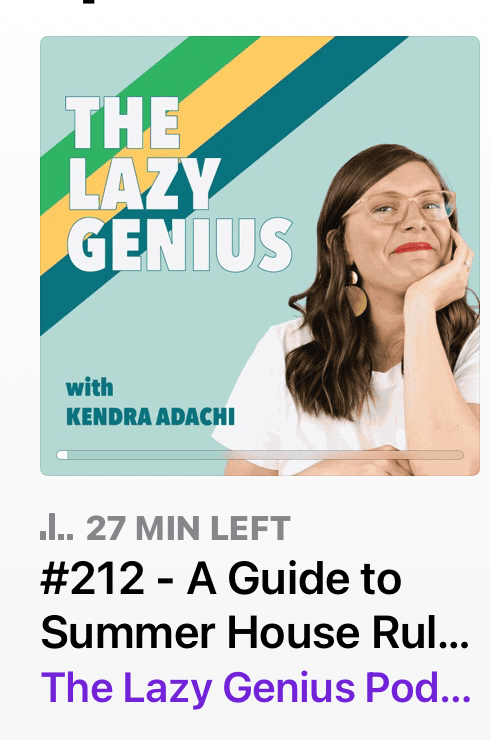 I started following Lazy Genius after reading her book and I just discovered her podcast. She has some very practical and useful tips for moms starting their summer with kids at home. She has some good stuff for my stage in life, too!