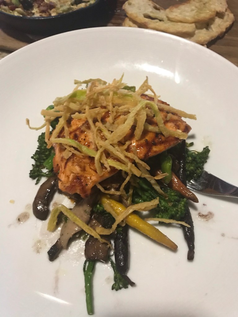 I ordered the salmon and it was so good. We shared a brussel sprouts appetizer and Beth got Nashville hot chicken.