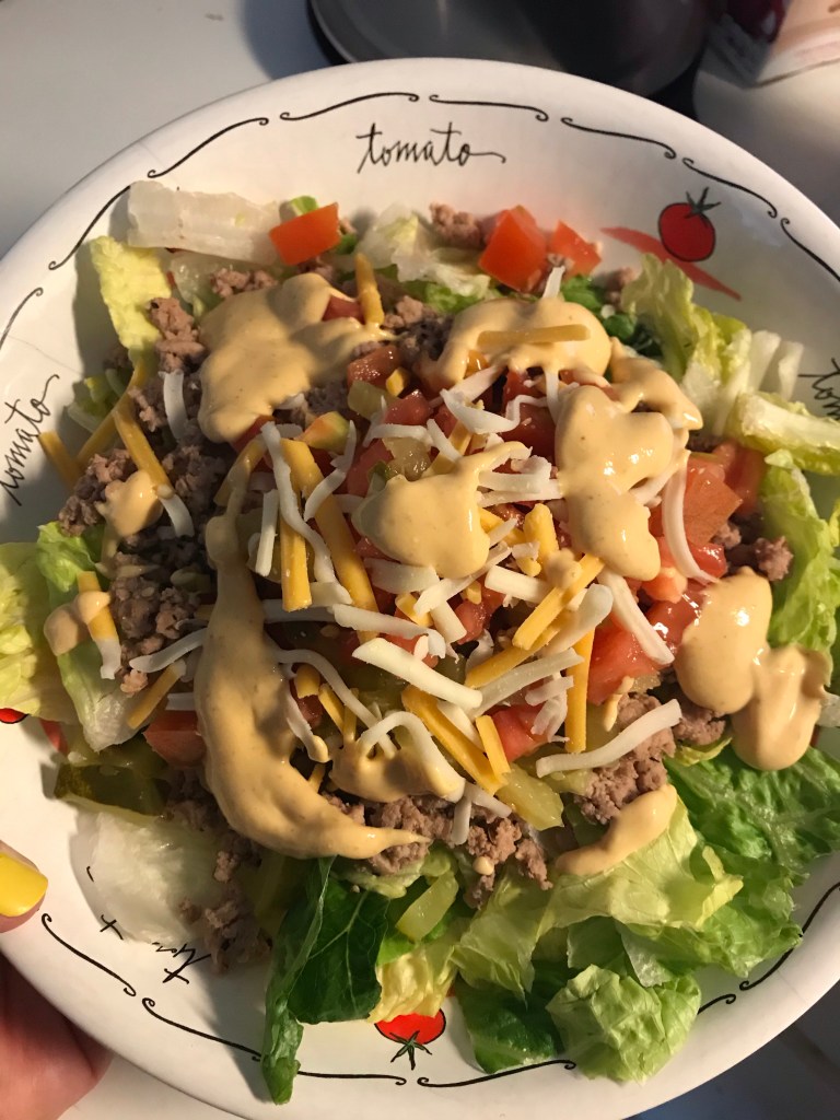 For lunch Friday, I tried cheeseburger salad with ground turkey and a “special” sauce made out of non-fat plain Greek yogurt. It was good – I had it again for dinner last night!