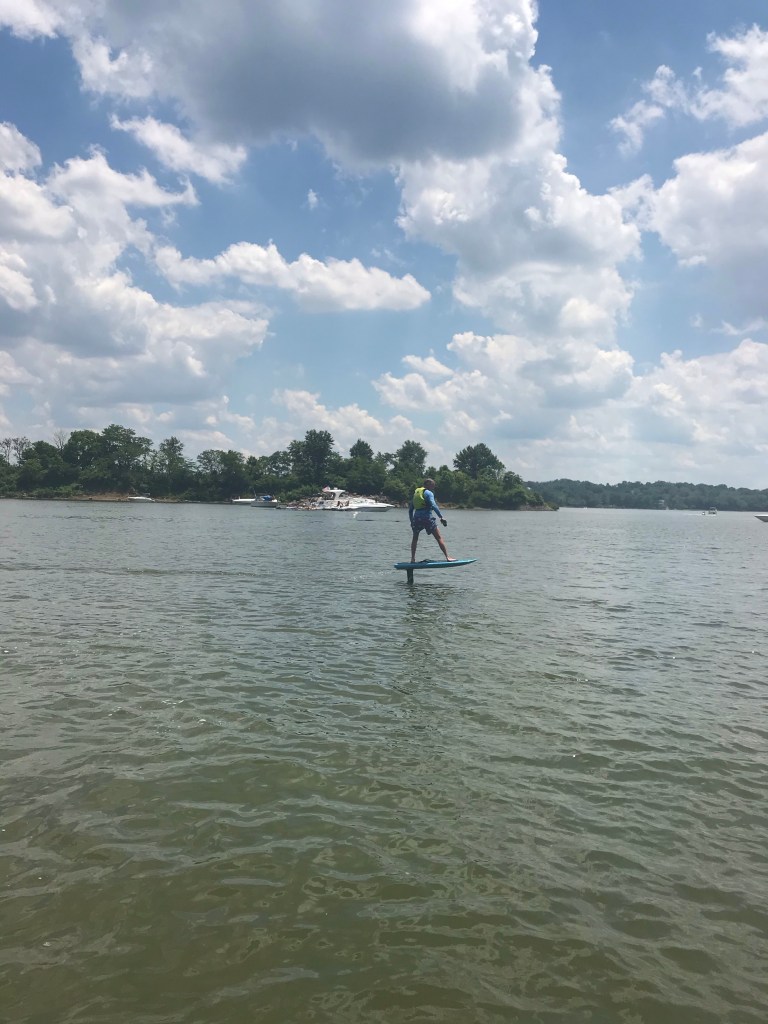 We saw this guy on a foil surfboard. He controlled it with a handheld device.