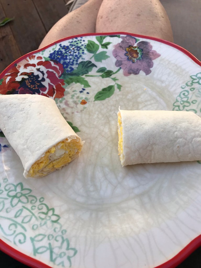 I came home and made a new breakfast favorite – a low carb tortilla with egg and cheese. I plan to add more items to this soon – onions, mushrooms, etc. I ate on the deck.