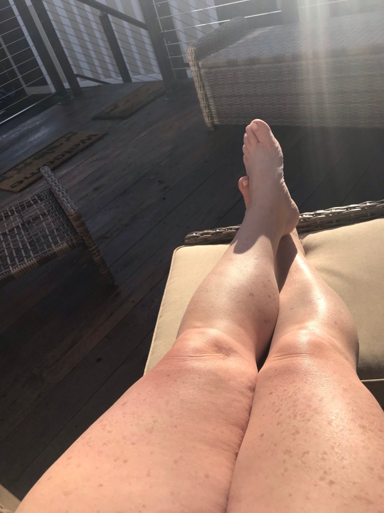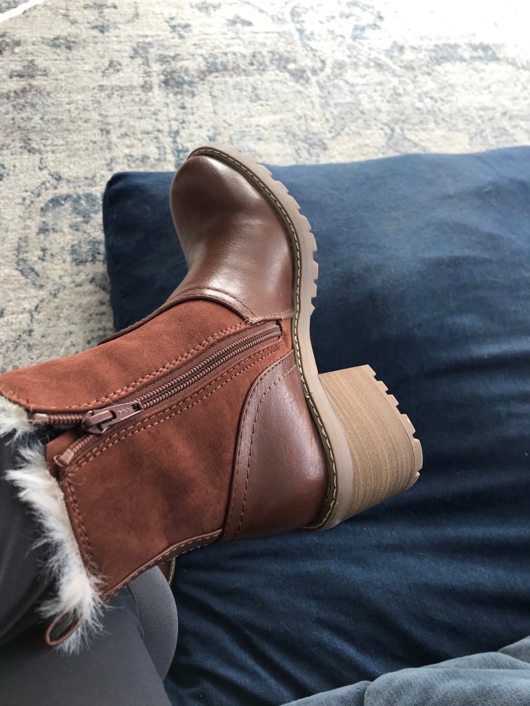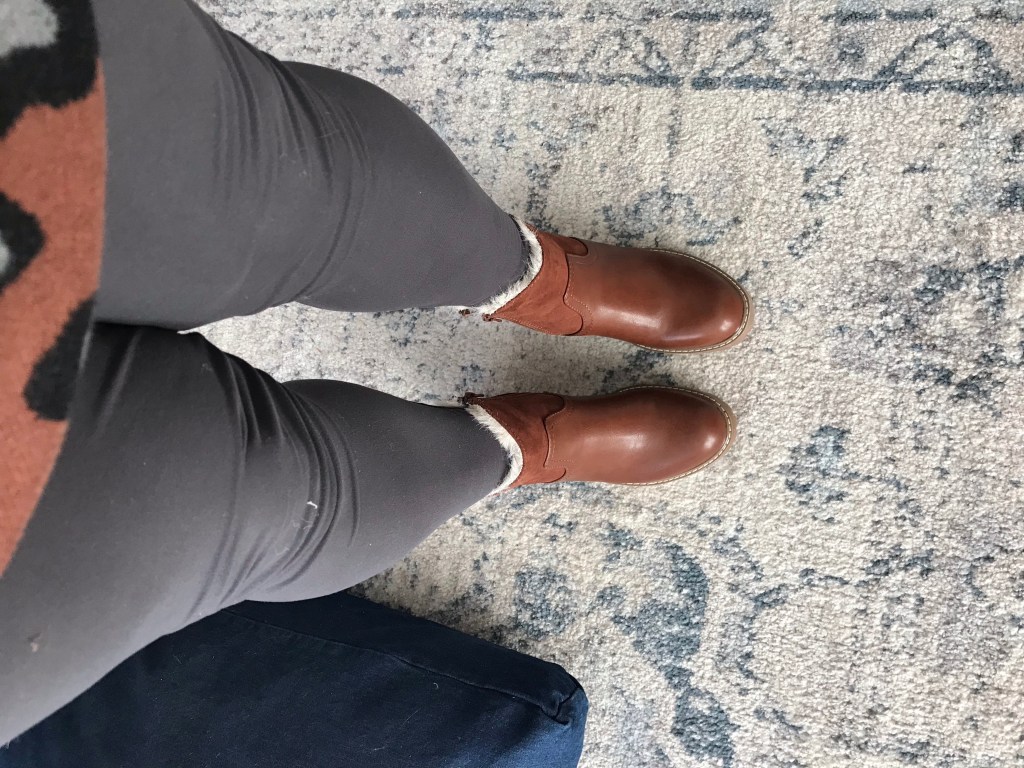 I have always been a jeans girl/woman; and have not really bought into the athleisure craze. I am very active and exercise a lot, but I prefer to keep my exercise clothes separate from my everyday look, you know? However, the pandemic and resulting at-home life has resulted in the embracing of some of this look. I bought two pairs of leggings and two tops from Prana. Here, I have the outfit styled with my super-comfy fuzzy Birks, and a lightweight scarf.