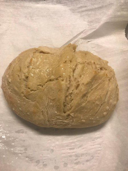 This is the no knead bread below. It is just flour, yeast, water. If you are having trouble finding yeast, I think they sometimes have it at CVS and Walgreen’s. The little markets are also a good source for things like yeast.