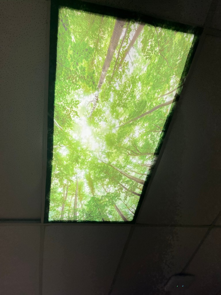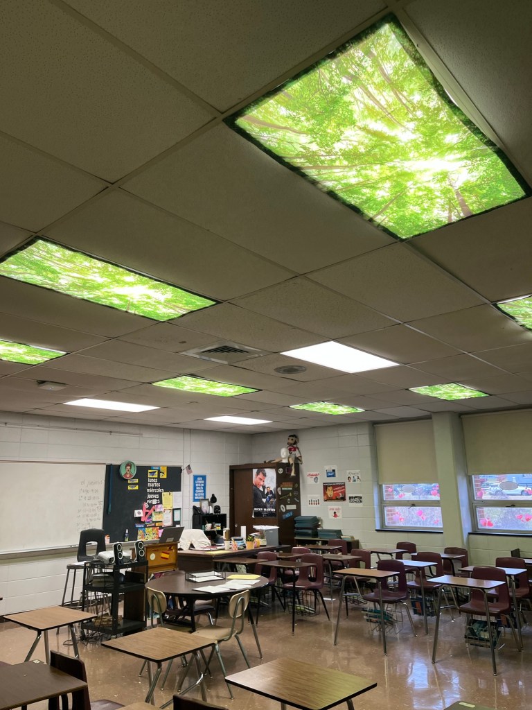 My classroom got a little glow up! Many of our teachers have been ordering these light cover panels and you can get clouds, beach, stars, etc. We have an Amazon allowance we can spend each year now. I picked this forest canopy design.