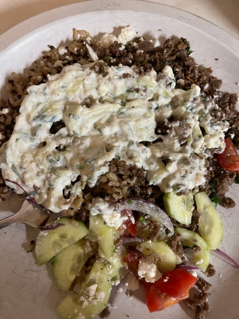 I told you all about Slender Kitchen on Tuesday and this is one of her recipes – the Beef Kofta Bowl. It’s like a Greek bowl but with beef. I had a brown rice and quinoa blend to put under this. We all loved it!