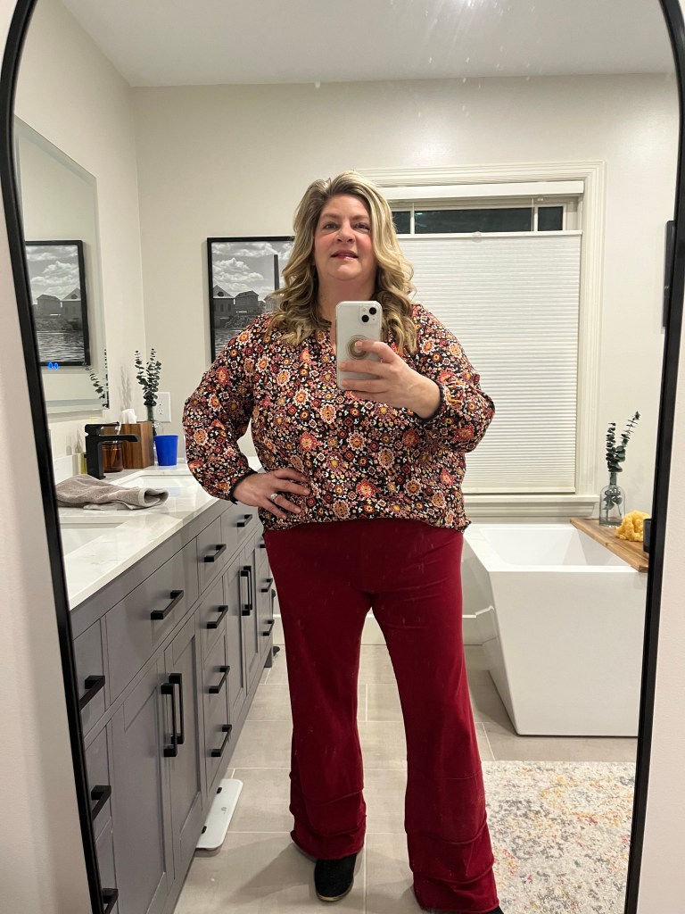 Monday I wore Matilda Jane flares and a consignment Loft top. Did you know that Matilda Jane has more than just the ruffle pants? I have several flares by this brand. It’s extremely awkward to hold your phone so that your face can show, lift your face so it looks like you are not looking at your phone while trying to take a picture, and be annoyed by your husband’s blue cup in the background and his heckling while I am doing this.
