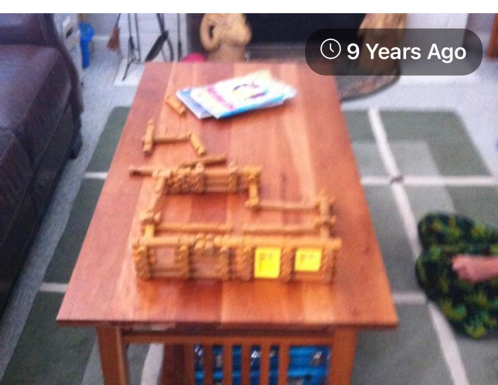 First, this was my morning strategy for the summers of my kids’ childhood. I would find a forgotten toy from the playroom toy closet and bring it to the family room. This day was the good ol’ set of Lincoln Logs.