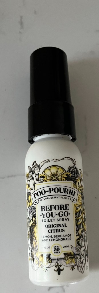 Poo-Pourri! If you are staying in someone’s home, it might be nice to have and I think I picked it up in the Target travel size bins. I keep it in our upstairs bathroom because we only have one bathroom upstairs right now.