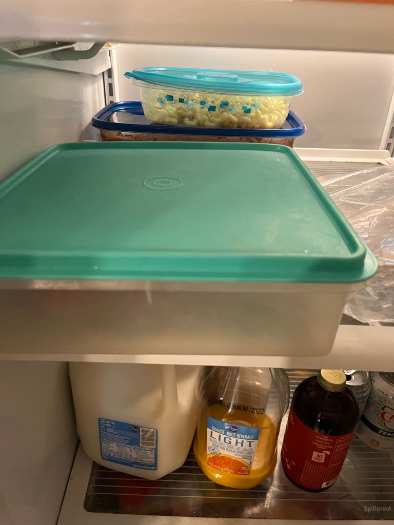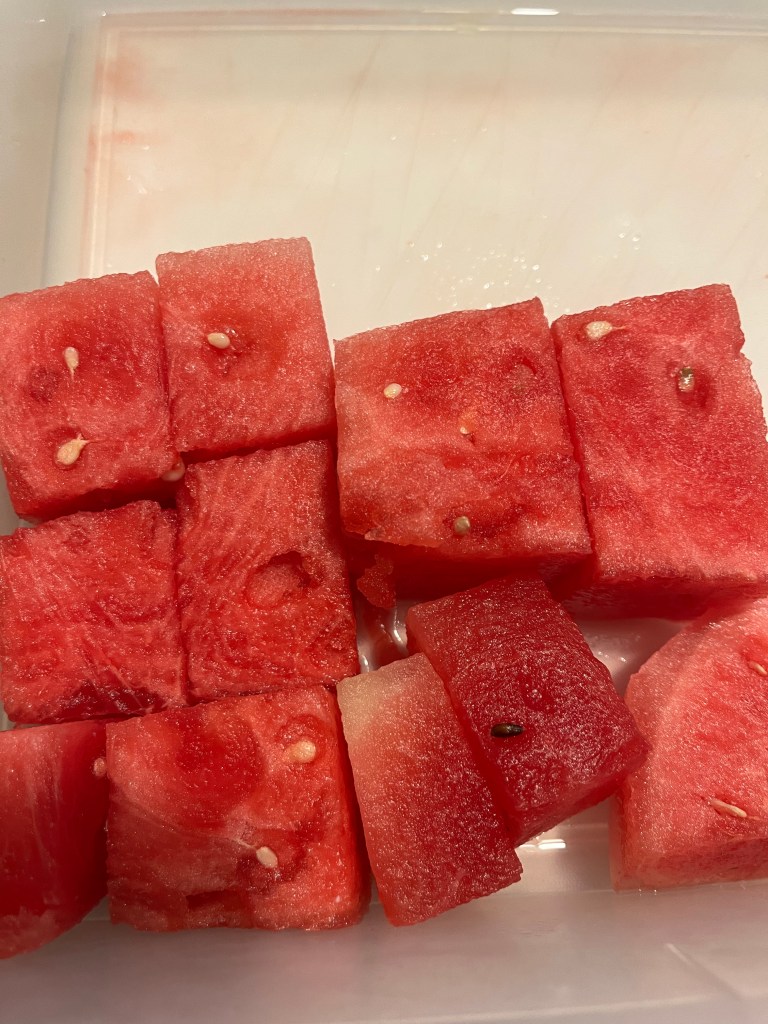 I bought a whole watermelon last week and it was the best one. I keep it cut up in this really old Tupperware container.